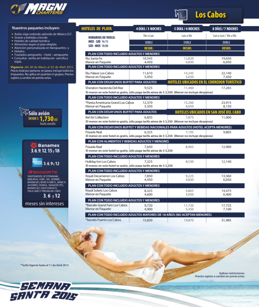 | Magnicharters -2015 -20131999-1697 8590-7561 5601-1493 Las tarifas publicadas son por persona (no aplica puentes,dias festivos ULTIMA SALIDA DE TARIFA MENOR GRATIS NOV 28 |