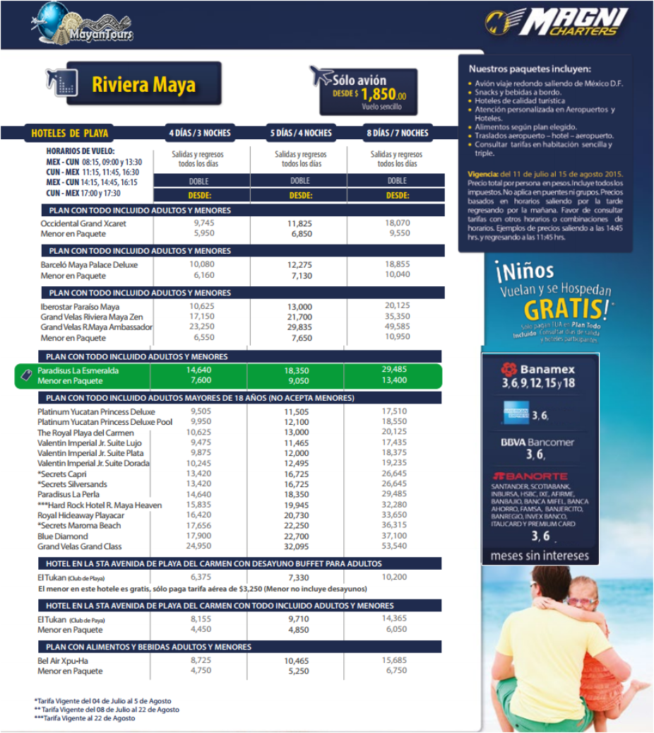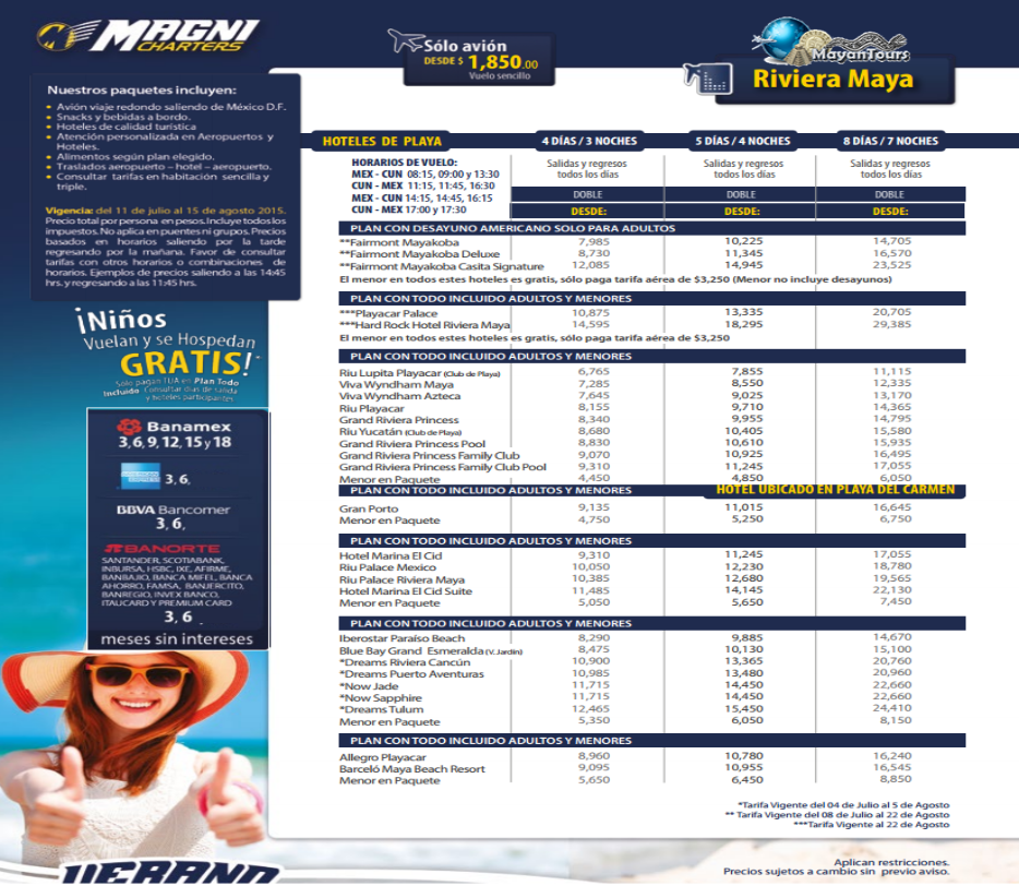 | Magnicharters -2014 -20131999-1697 8590-7561 5601-1493 Las tarifas publicadas son por persona (no aplica puentes,dias festivos ULTIMA SALIDA DE TARIFA MENOR GRATIS NOV 28 |
