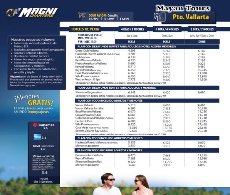 | Magnicharters -2014 -20131999-1697 8590-7561 5601-1493 Precio por persona, menor Vuela Gratis consultar fechas y hteles participantes Las tarifas publicadas son por persona (no aplica puentes,dias festivos ULTIMA SALIDA DE TARIFA MENOR GRATIS NOV 28 |